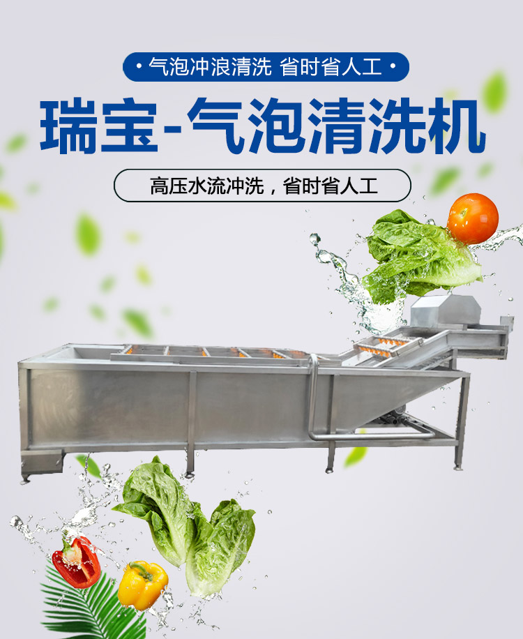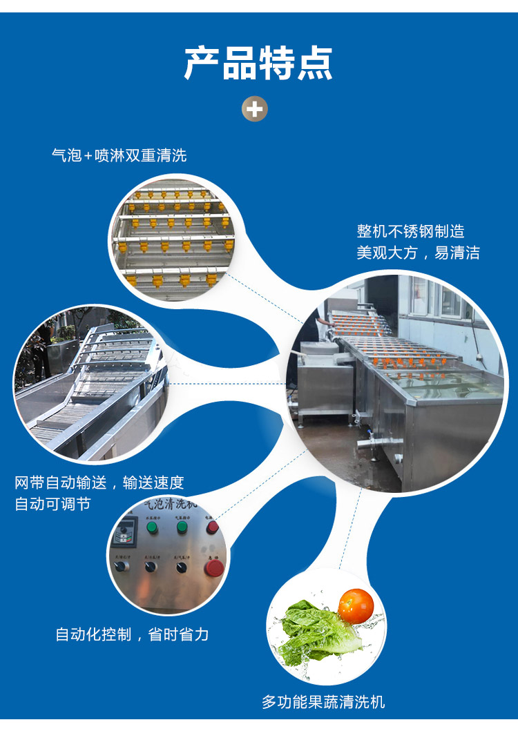 該設(shè)備為翻浪式氣浴蔬菜清洗機(jī);主要由清洗噴淋管路裝置、氣流翻浪裝置、陣列式數(shù)控沖網(wǎng)料箱、電氣集成控制裝置組成。整機(jī)結(jié)構(gòu)全部采用304不銹鋼制作、結(jié)構(gòu)緊湊、耐用。